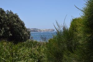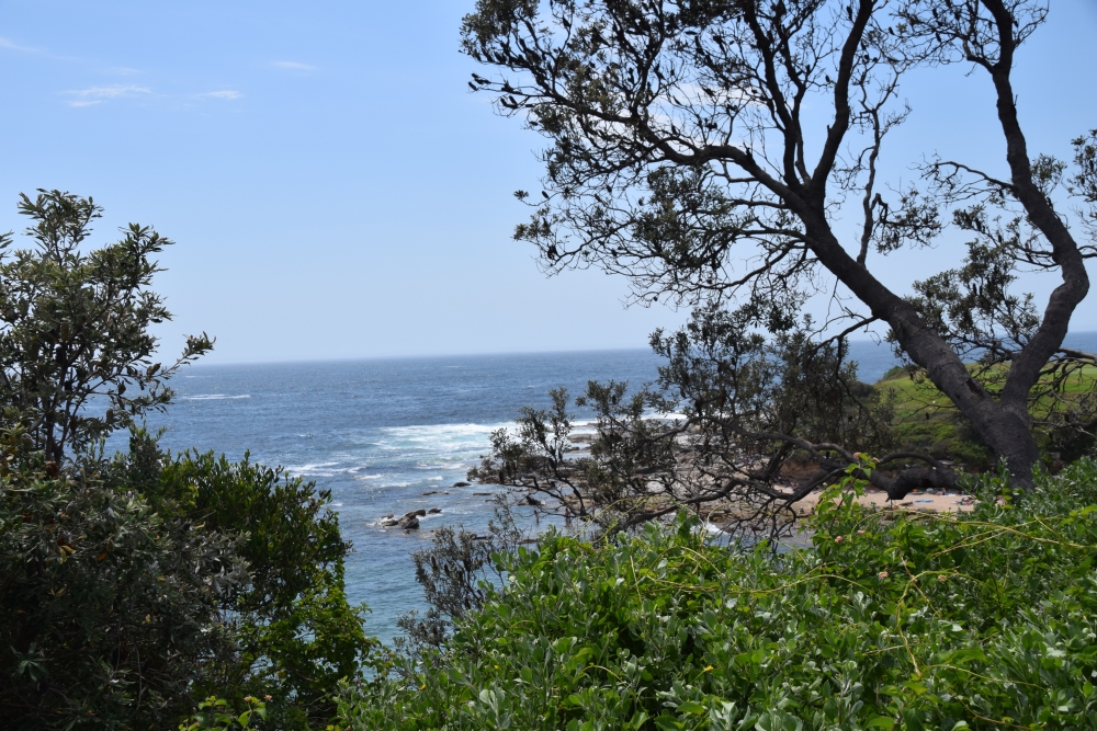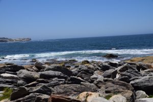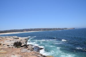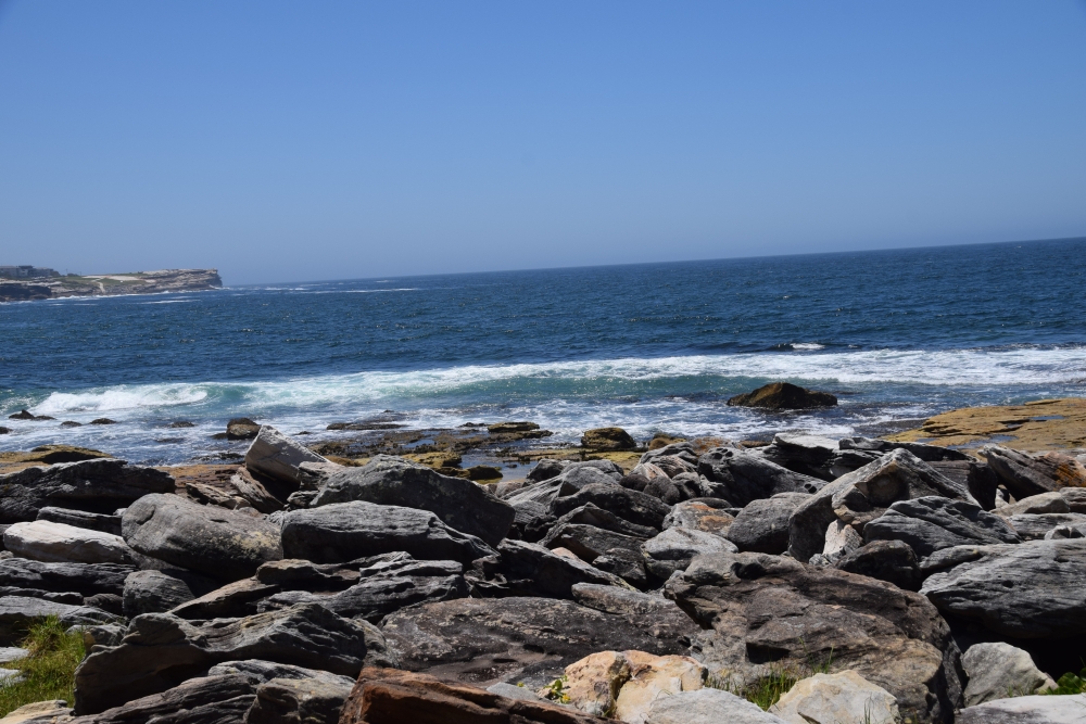 zu Fuß ans Südende unseres Hausstrandes, Maroubra Beach, auf. Die Sonne knallt bei strahlend blauem Himmel und 35 Grad vom Himmel. Der Wind macht Pause und wir merken schnell, dass es kein guter Tag ist, um in der Mittagszeit eine Wanderung zu machen. Eindeutig: der Sommer ist da!