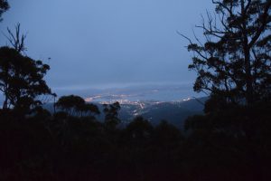 Wie werfen einen kurzen Blick auf den erhofften Ausblick auf Hobart und warten auf Abschleppwagen und Taxi, die uns und unser qualmendes Auto sicher zurück ins Tal bringen.