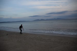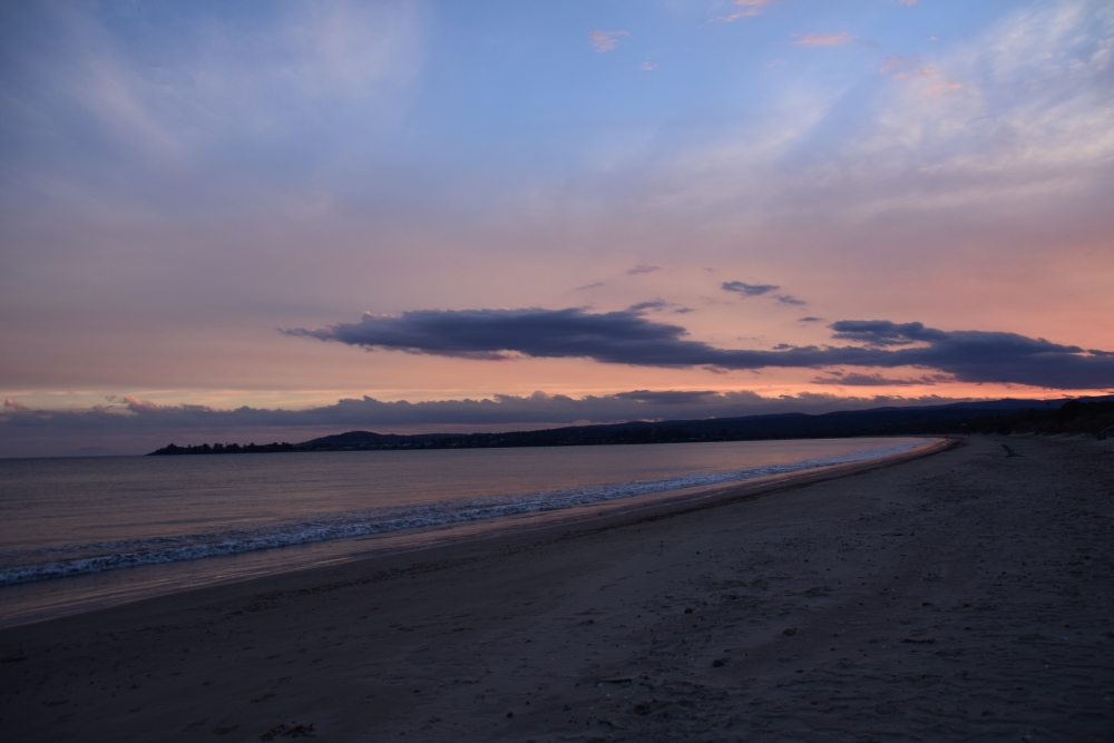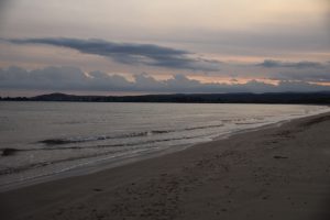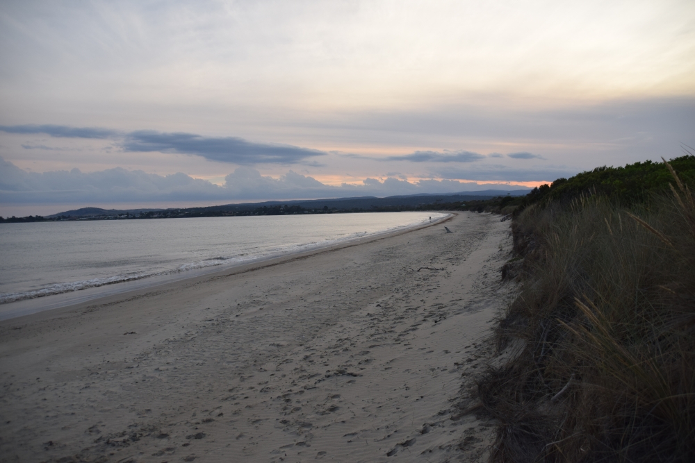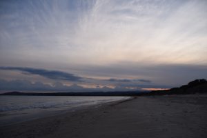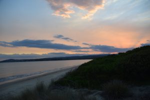 Danach treten wir Richtung Nordosten unsere Rückreise an. Wir halten noch am Nine Mile Beach und erleben eine wundervolle Abendstimmung am einsamen Strand. Muscheln sammeln, Steine über das Wasser flitzen lassen, den weichen Sand im Sonnenuntergangslicht genießen, einfach schön! Das angrenzende Naturschutzgebiet beeindruckt durch eine unglaubliche Vogelstimmenvielfalt und im letzten Sonnenlicht hoppeln zahlreiche Kängurus über die Wiesen.