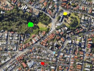 Einen Katzensprung von der Schule entfernt finden wir einen regelwaldartigen Park, den Cooper Park. Erstaunlich wie nah das alles beisammen liegt. Unser Wohnhaus (rot), die Schule ( gelb) und der Park (grün).