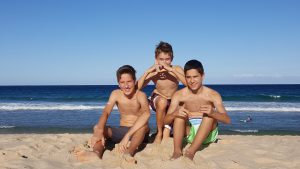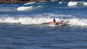 Vorher haben wir alle zusammen bei einem letzten gemeinsamen Wellelbad Abschied von unserem Lieblingsstrand genommen. Der Wind herbstlich frisch, das Wasser mit 24,2° gefühlt badewannenwarm.